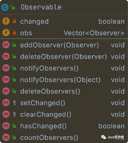 obs:观察者列表(observers),一个线程安全的列表集合:Vector,默认为空集合;