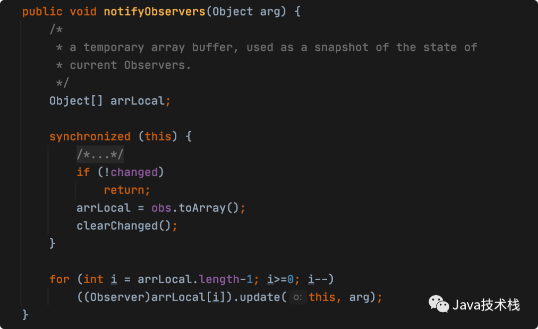 先获取同步锁,判断状态是否更新,如已更新则清空观察目标状态,然后再使用 for 循环遍历所有观察者,一一调用观察者的更新方法通知观察者更新。