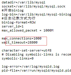 坑就坑在这里了,这里查出来的wait_timeout的值显示的是28800秒,误导我以为数据库配置的wait_timeout就是28800,然而并不是,一次偶然的机会,执行了下 vim /etc/my.cnf ,